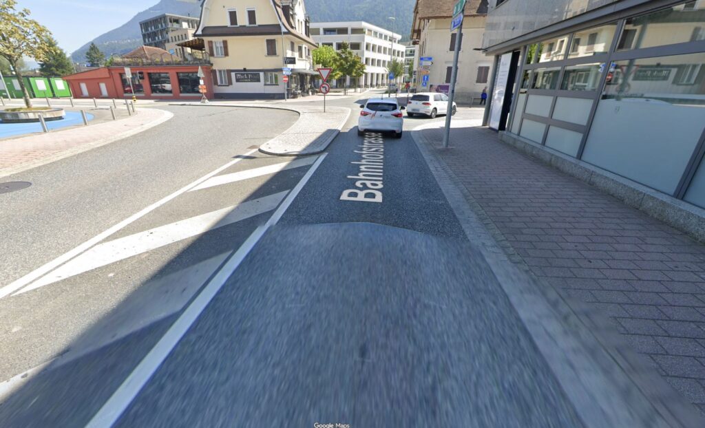 Rund um das Amtsgebäude nach Links in die Poststrasse in Richtung Buchs/Vaduz/Bendern.